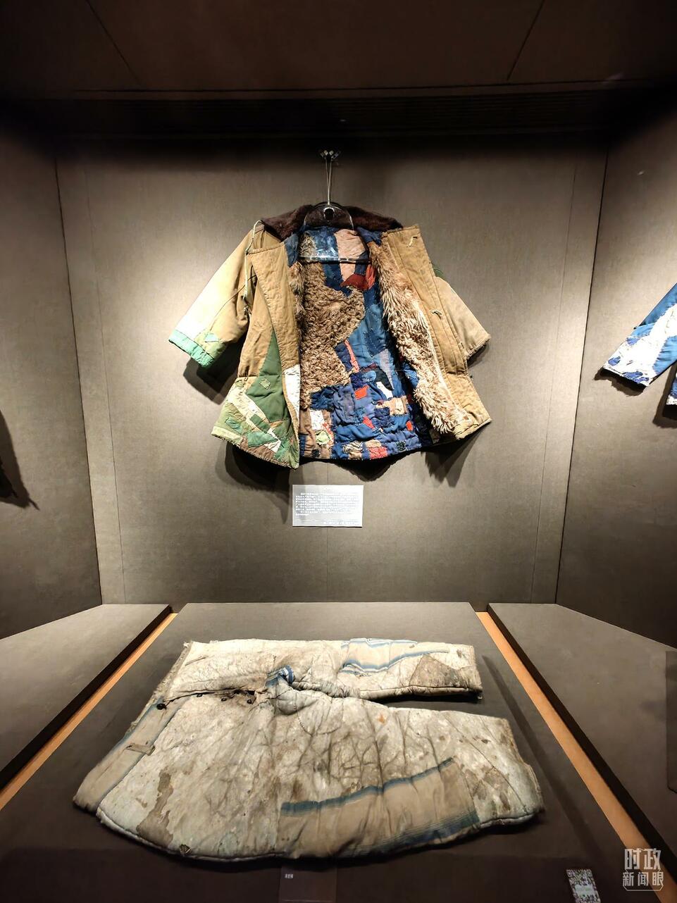 △博物馆内陈列着一件镇馆之宝——“百衲衣”,这件1950年配发的军大衣来自老军垦战士王德明,衣服上补满了大大小小各种颜色的补丁296块。(总台央视记者彭汉明拍摄)