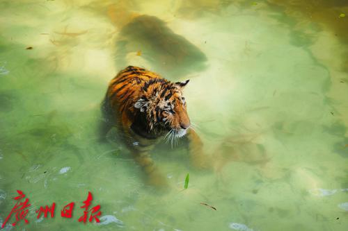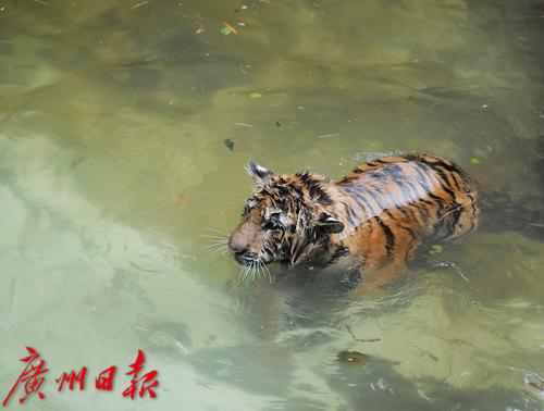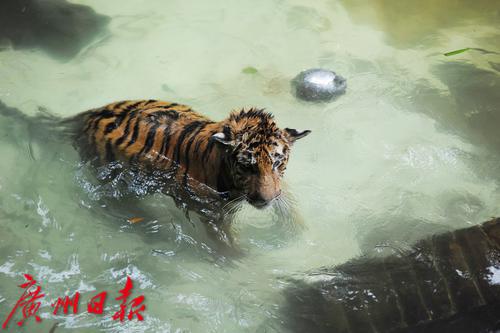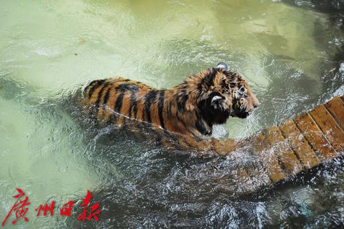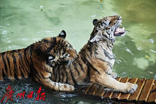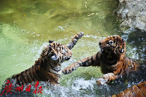 长隆野生动物世界内,一只孟加拉虎幼虎与一只东北虎幼虎在户外水池内开心嬉耍。