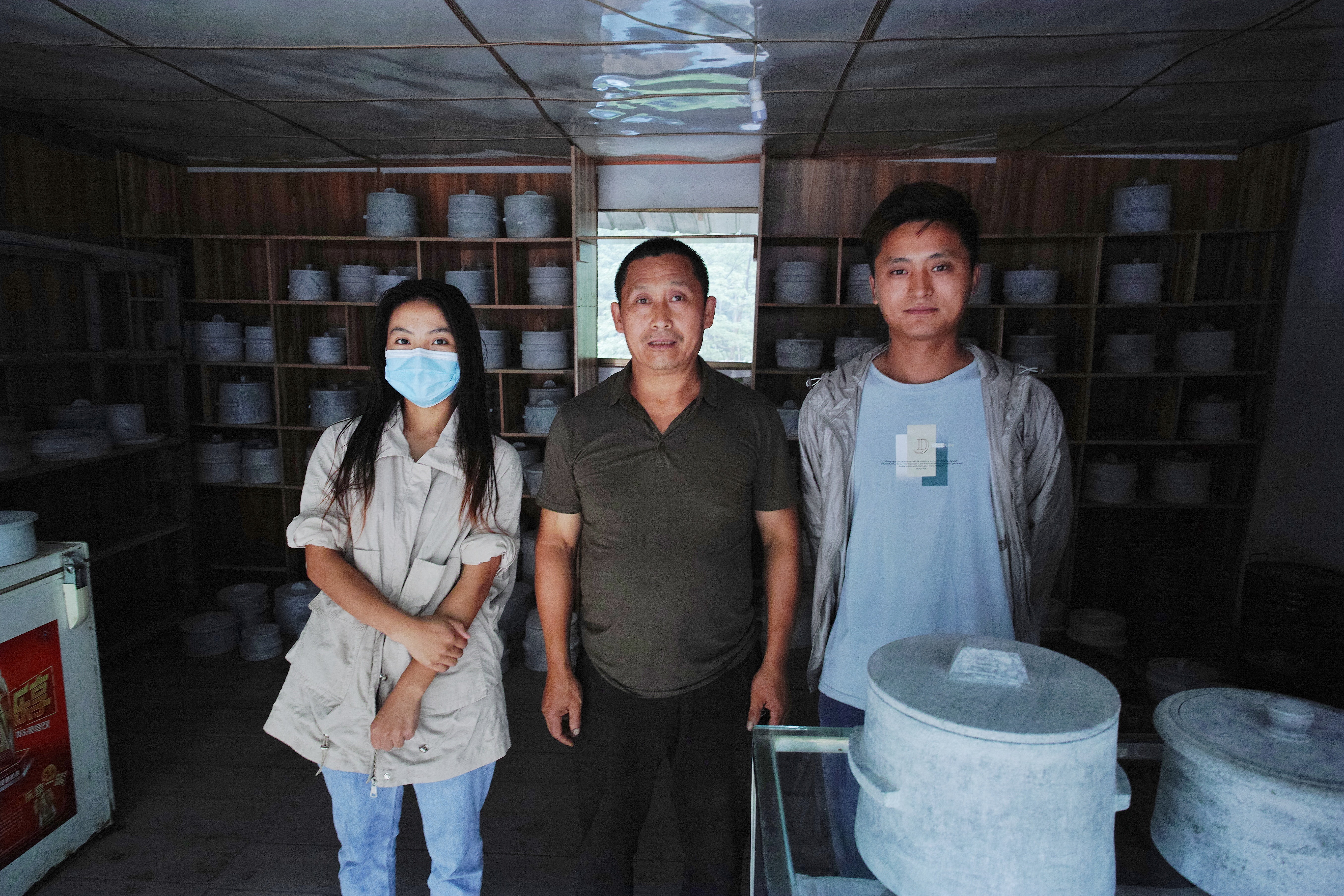 达国大桥也是赖鑫的“致富桥”,该大桥2019年才正式通车。在广东援藏干部的帮助下,赖鑫也把自己的小超市从原来距离大桥几十米开外的低洼处迁移到了达国大桥桥头。每年3月到9月是墨脱的旅游旺季,很多自驾游游客前来,他的“桥头超市”也成为墨脱一景,出现在不少游客的直播背景中。旺季的时候,超市每天有四五百元营业额,而店中最吸引游客的还是当地的特色产品——墨脱石锅。“墨脱石锅是我们的地理标志产品,富含十几种矿物质,用石锅煮出来的食物味道格外鲜美。”说起墨脱石锅,赖鑫格外自豪。这些石锅大小不一,直径从20厘米到40厘不等,价格也从几百元到几千元不等,全部是赖鑫和儿子赖鸿臣自己打磨出来的。