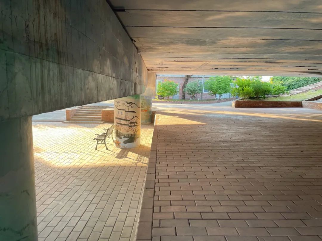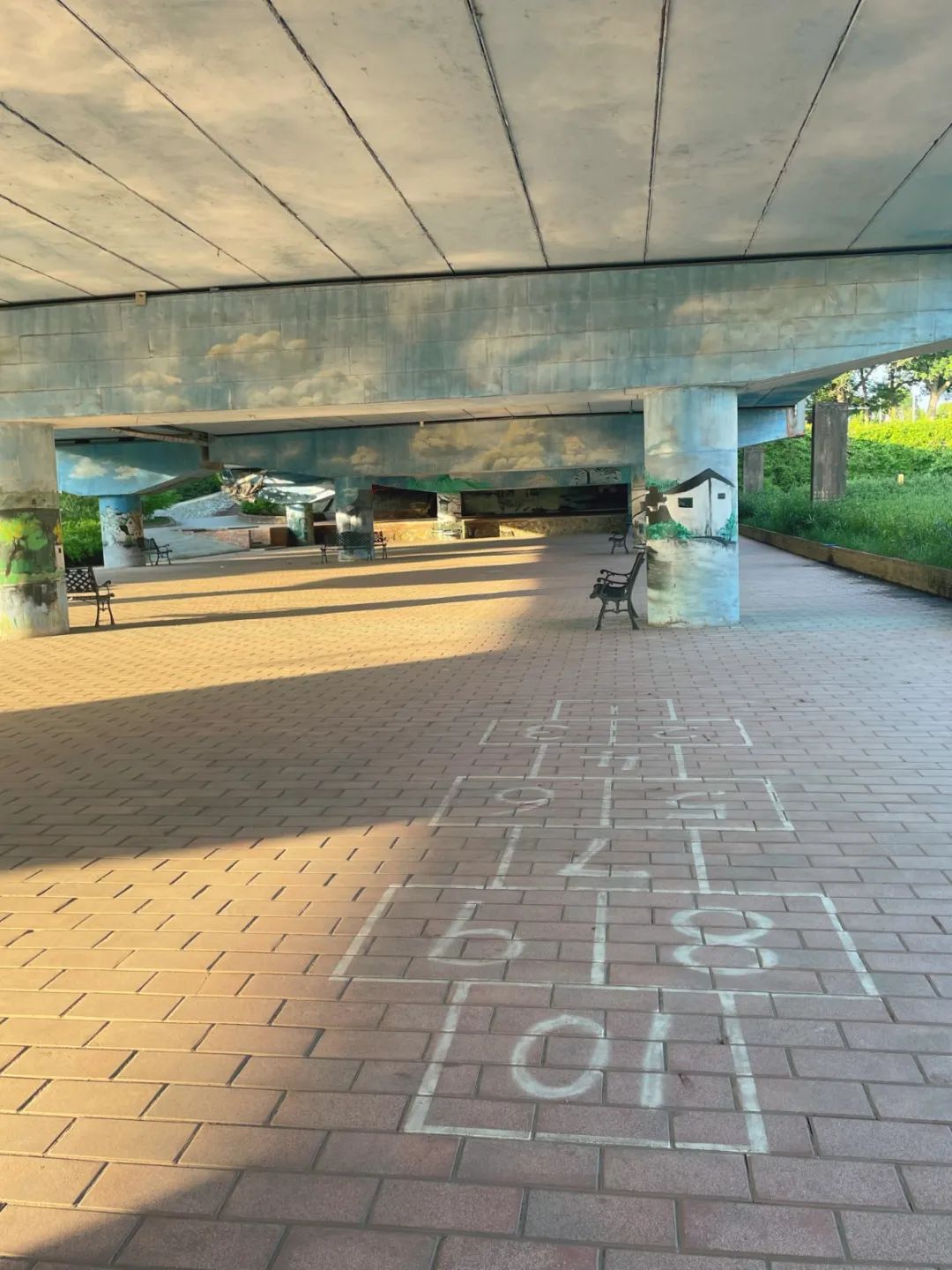夏日傍晚的阳光散发着金色的光芒,桥底光影和好看的涂鸦相映,微风阵阵,鸟叫蝉鸣,坐在长凳上放松休息,感受人与自然的和谐气息。