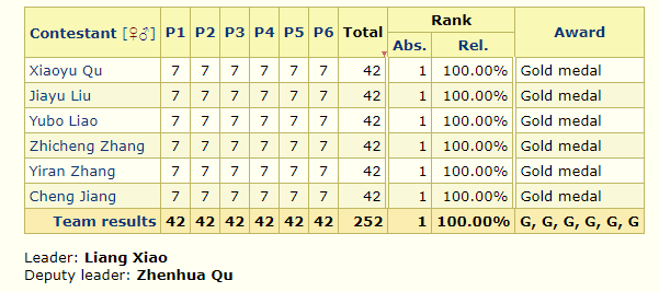 江城、张贻然两位同学则来自上海中学。据新民晚报7月15日报道,两名上海中学参赛选手的指导教师王广廷表示,“得到满分还是很有难度的,上中历史上一共获得14块IMO金牌,只有5人拿到了满分。”他介绍,唯有做到思路正确,细节完善清晰,方能被判定为满分答卷。