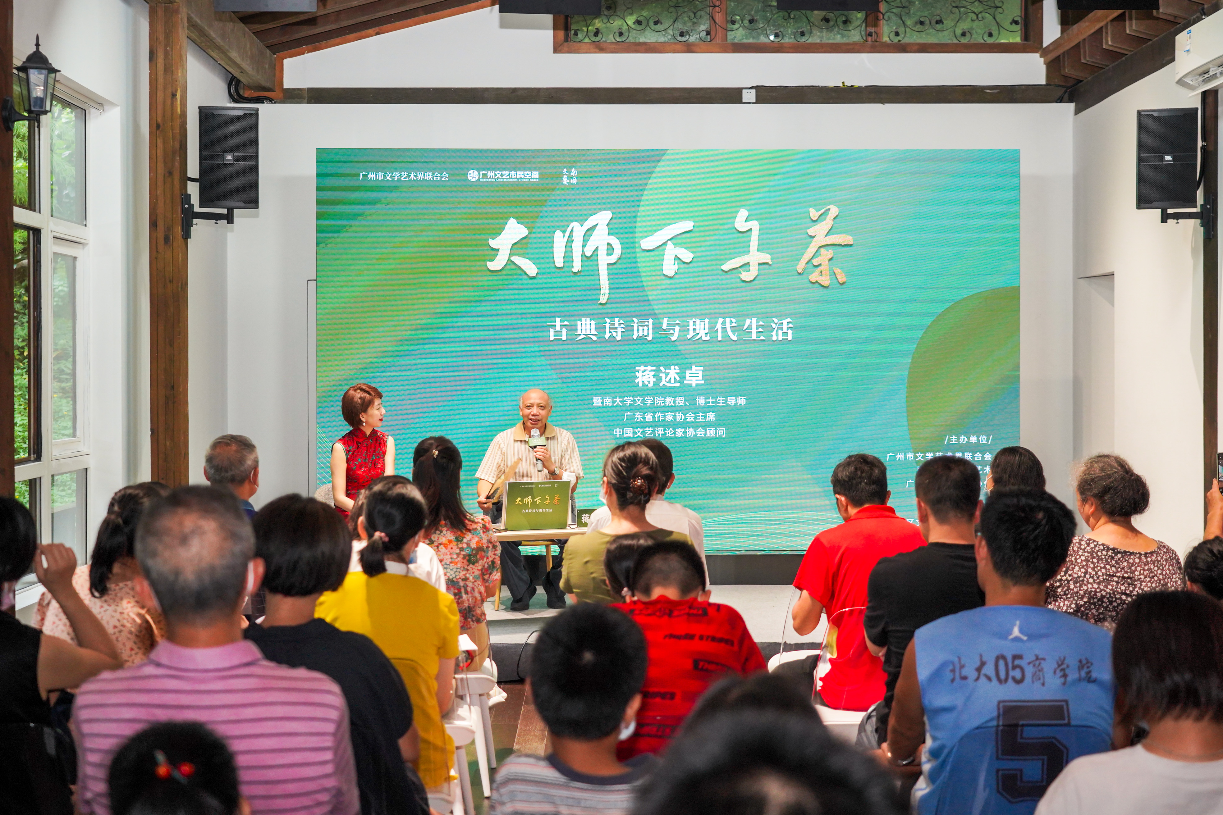 7月17日,广州文艺市民空间“大师下午茶”活动在珠江公园湾区书屋成功举办。暨南大学文学院教授、博士生导师、广东省作家协会主席、中国文艺评论家协会顾问蒋述卓以“古典诗词与现代生活”为主题,梳理了古典诗词中蕴含的诸多智慧及其对现代生活的启示。活动现场,广州文艺市民特色空间(湾区书屋)正式挂牌,“广州文艺市民特色空间”再添新地标。