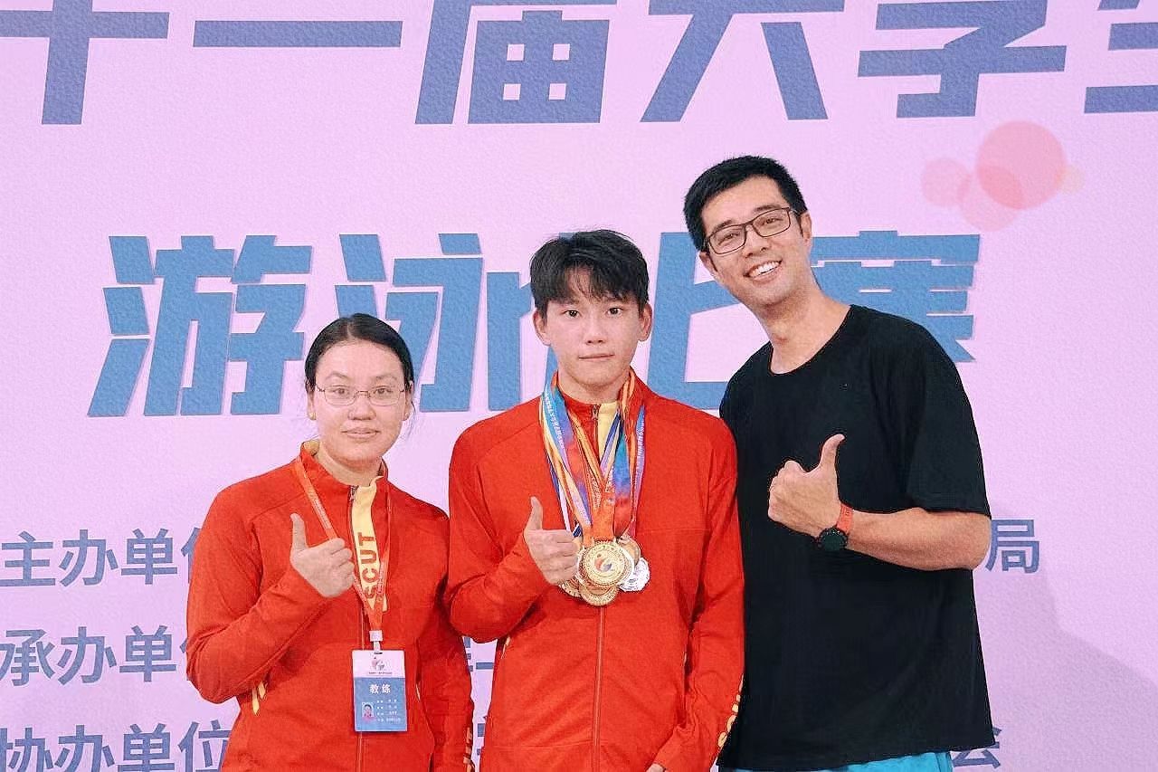 陈梓涵(中)在第十一届大学生运动会上获得三枚金牌。