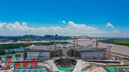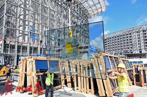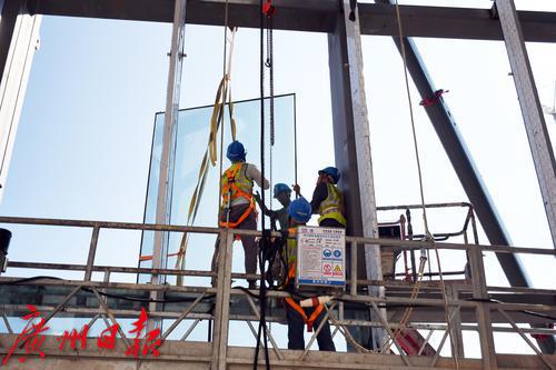 2022年7月19日,南沙。记者日前从南沙明珠湾管理局获悉,随着第一块构件式玻璃安装,国际金融论坛(IFF)永久会址项目国际会议中心正式进入幕墙安装阶段,“木棉花”开始穿“花衣”啦!