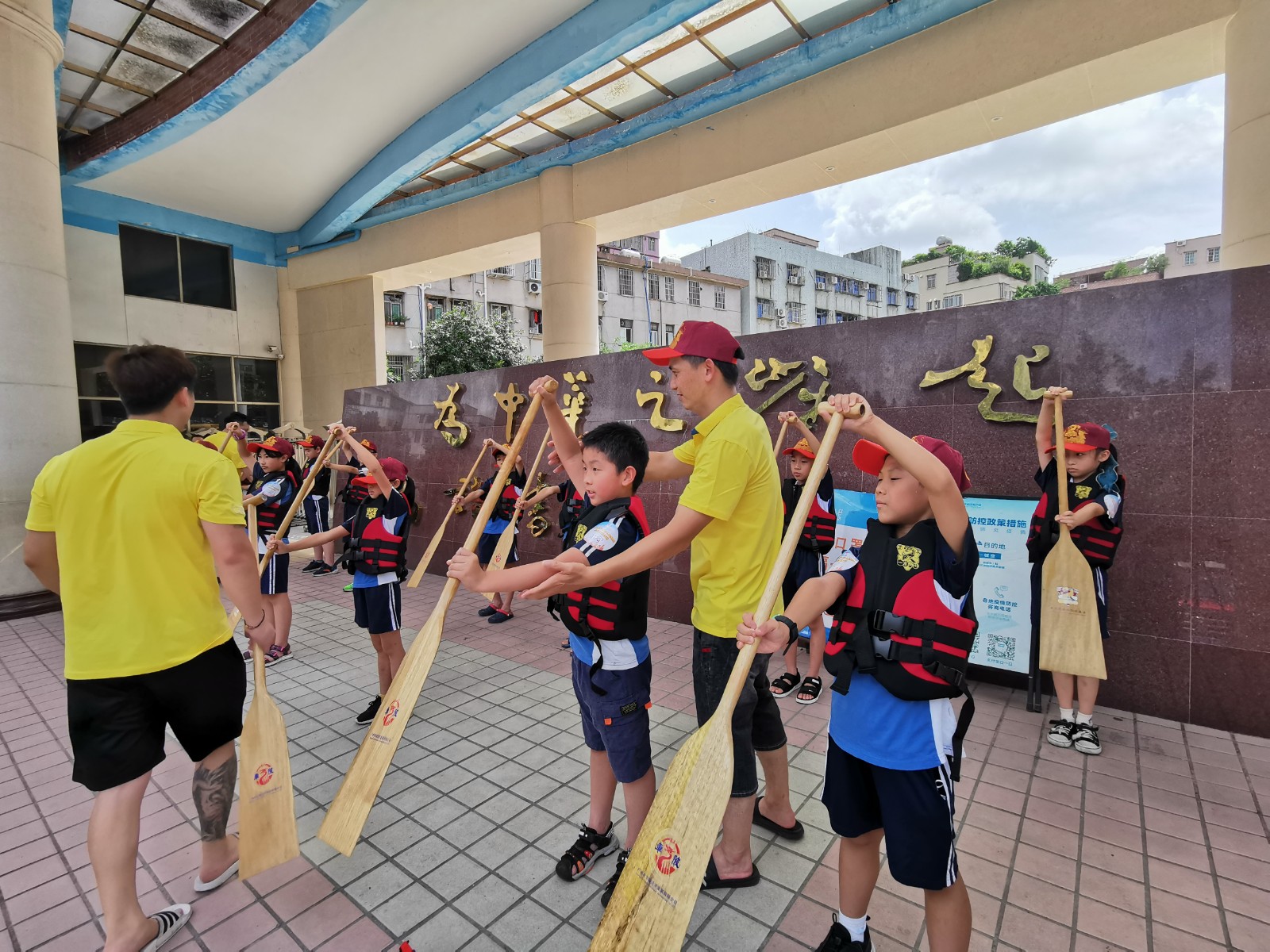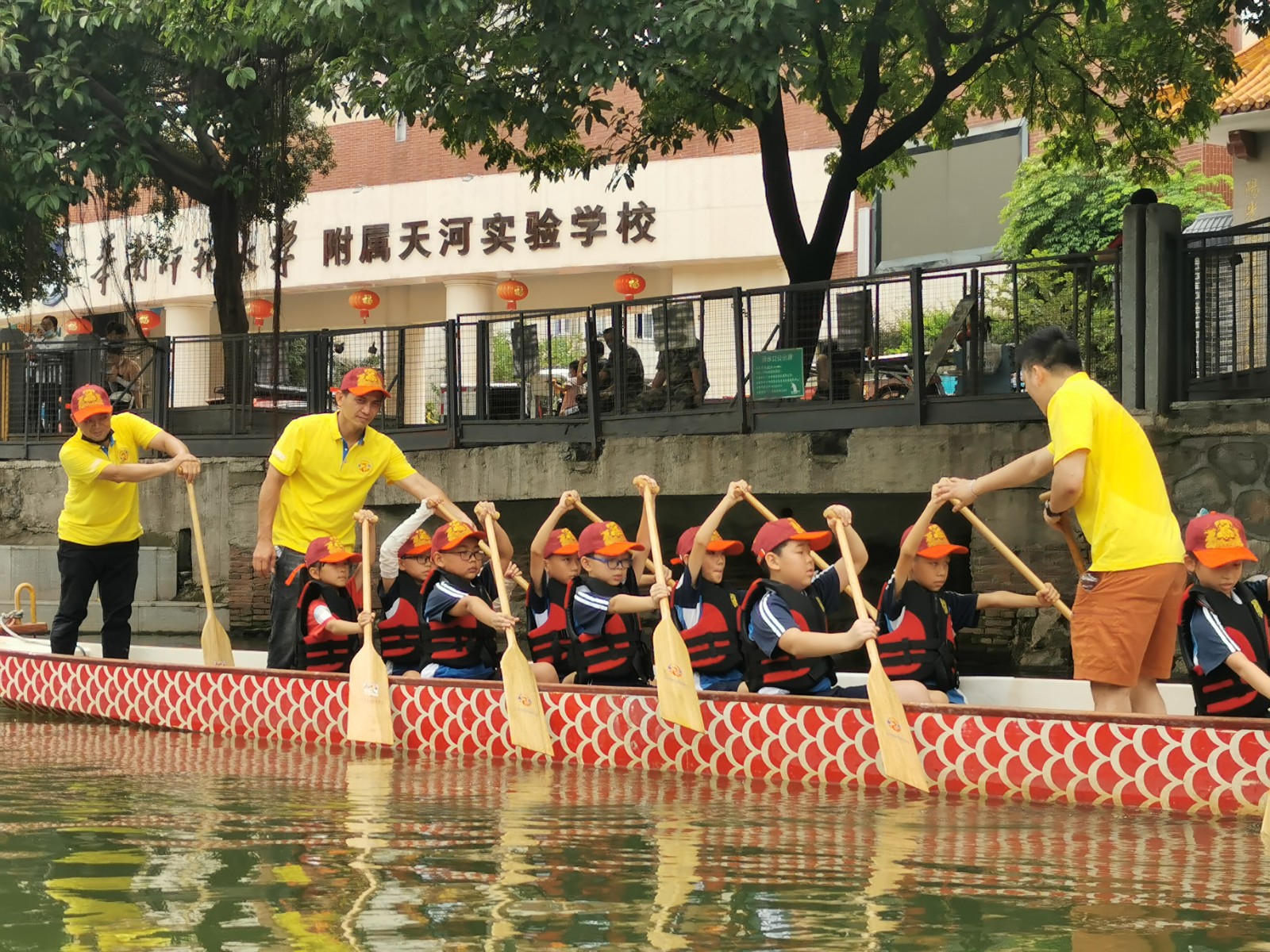 17日上午,扒龙舟课程正式开始。同学们首先在岸上做足热身运动,学习扒龙舟的步骤和技巧。通过教练们悉心指导以及亲身示范,孩子们迅速找到扒龙舟的要领。在穿好救生衣后,大家整装待发,依次有序上船,有模有样地学着教练扒了起来,真实感受到扒龙舟的乐趣。