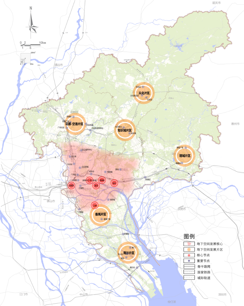 在地下空间总体布局方面,《规划》根据《广州市国土空间总体规划(2021-2035 年)》,结合地下空间需求分析,以轨道交通网络为骨架,多线换乘(枢纽)站点为节点统筹地下空间片区发展,形成“一核、一网、六片”的空间结构。一核指中心城区,为地下空间发展核心区;一网指规划轨道交通网络;六片为花都—空港、知识城、从化、增城、番禺和南沙地下空间发展片区。