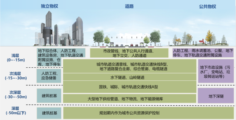 《规划》同时提出,城市地下空间竖向应遵循分层利用、由浅入深的原则,可分为四层,浅层埋深 0-15米,次浅层埋深 15-30米,次深层埋深 30-50米,深层埋深>50米。规划期内以浅层和次浅层空间为重点开发区域,适当拓展次深层空间,深层空间(除局部桩基需要外)作为远景开发资源予以保护控制。局部地区因特殊需求经论证可适当加大地下空间开发深度,地质条件较差的地区需采取相应的工程措施。