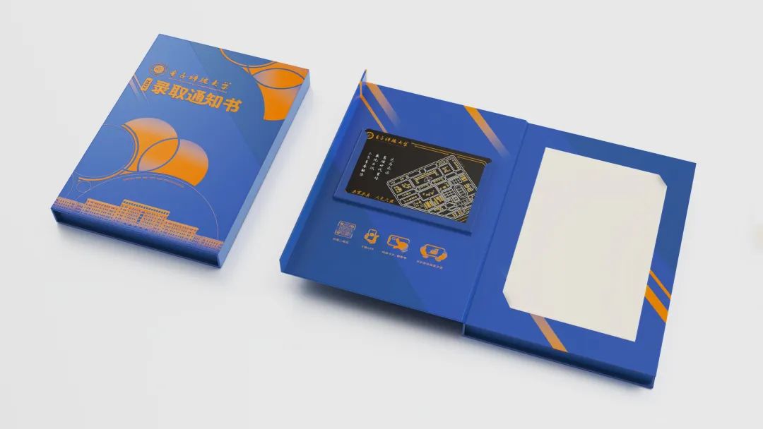 打开录取通知书,就像打开了一本等待探索研究的书籍,画面整体选用电子科技大学logo的主色——科技蓝和银杏黄,做出充满现代感的撞色设计。