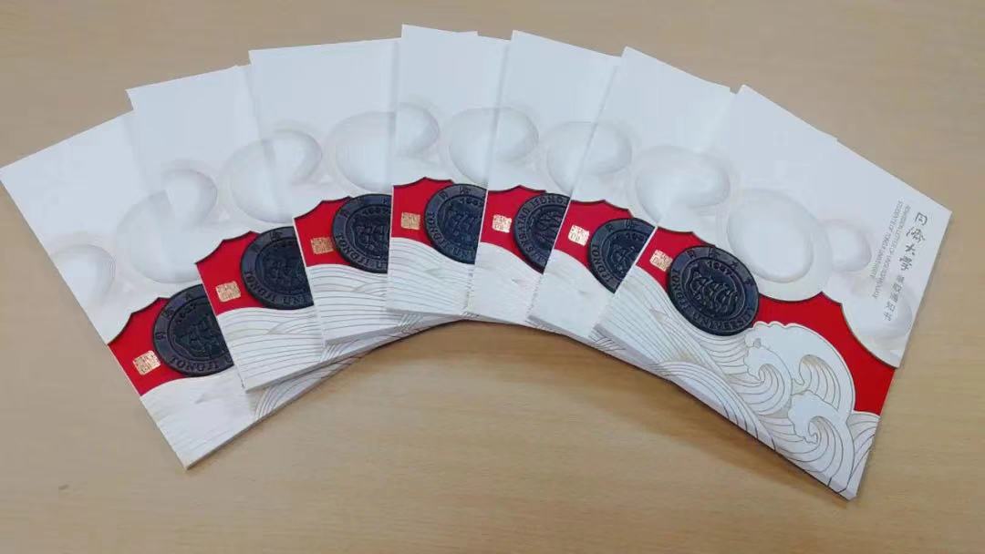 红彤彤的包装袋喜气洋洋,是同济大学为新生送上的第一份祝福——“大展’红’图”。打开包装袋,磨砂质感的同济大学校标,映入眼帘。巧妙的是,它还是一枚冰箱贴,新生们可以把它留在家里,世界再大,家是起点。