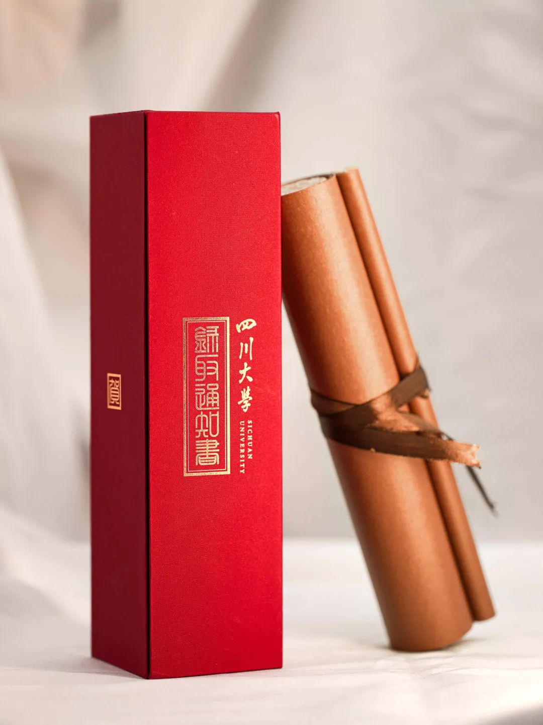 新版的录取通知书,以“锦凤传书”为设计概念,采用了新颖独特的书卷形式,书卷徐徐展开,古朴且富有历史厚重感。卷首是一只凤鸟,环绕着四川大学的标志,凤首口衔录取通知书。卷尾是翻涌的海浪,象征川大“海纳百川,有容乃大”的校训。