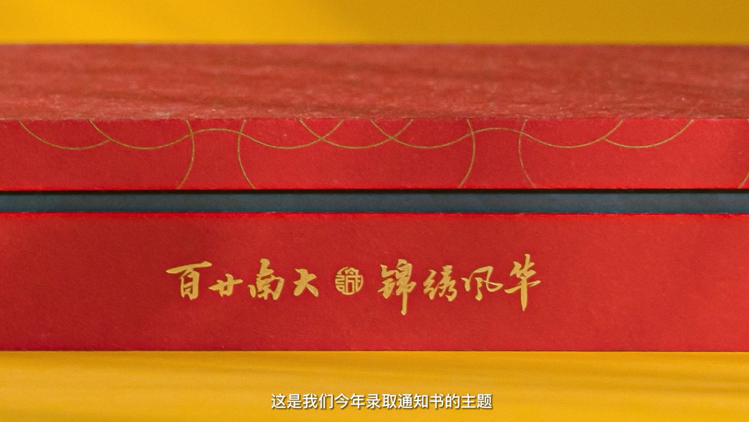 今年南京大学的录取仪式盒以“百廿南大 锦绣风华”为主题。《好事近》诗词文字,祝贺考生金榜题名,踏上锦绣前程,高低起伏的韵律纹理体现核心立意。