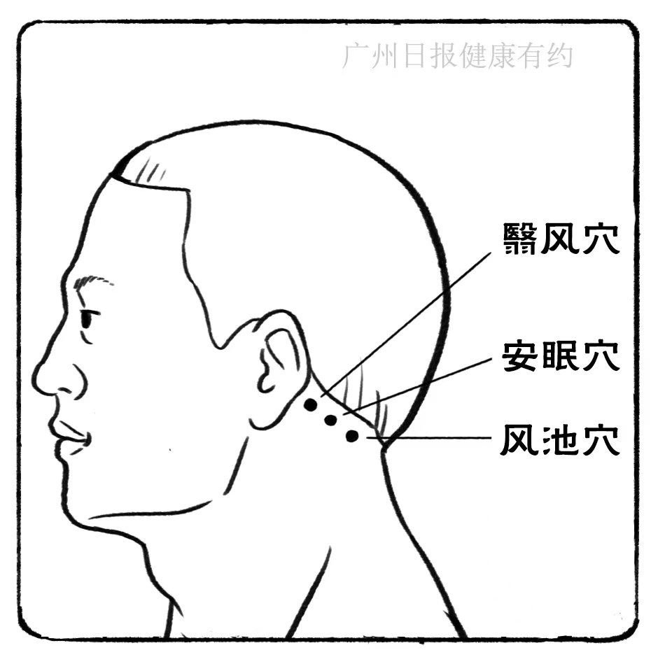取穴:先找到位于耳垂后下方凹陷处的翳风穴,然后再找到风池穴,接着用手在两点之间画一条线,线的中点就是安眠穴。