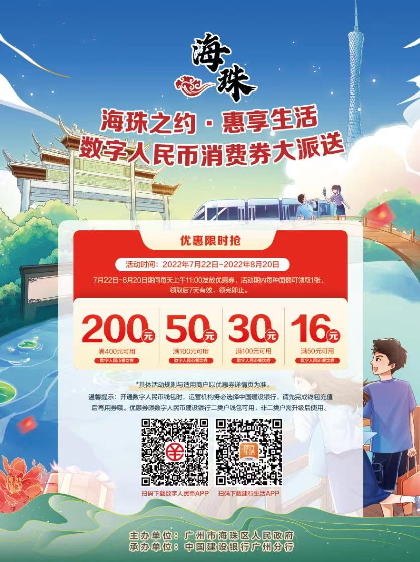 7月21日,海珠区公布,该区数字人民币消费券红包即将发放,最高优惠400-200。