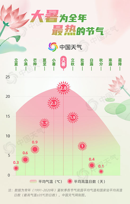 “南州大暑何可当,雪冰不解三伏凉”。大暑正好处于“中伏”前后时期,为一年中最热的时段,此时节最真切的感受就是热。中国天气网通过盘点1991年至2020年气象大数据发现,大暑节气的平均气温在24节气中最高,平均高温日数也是最多的。