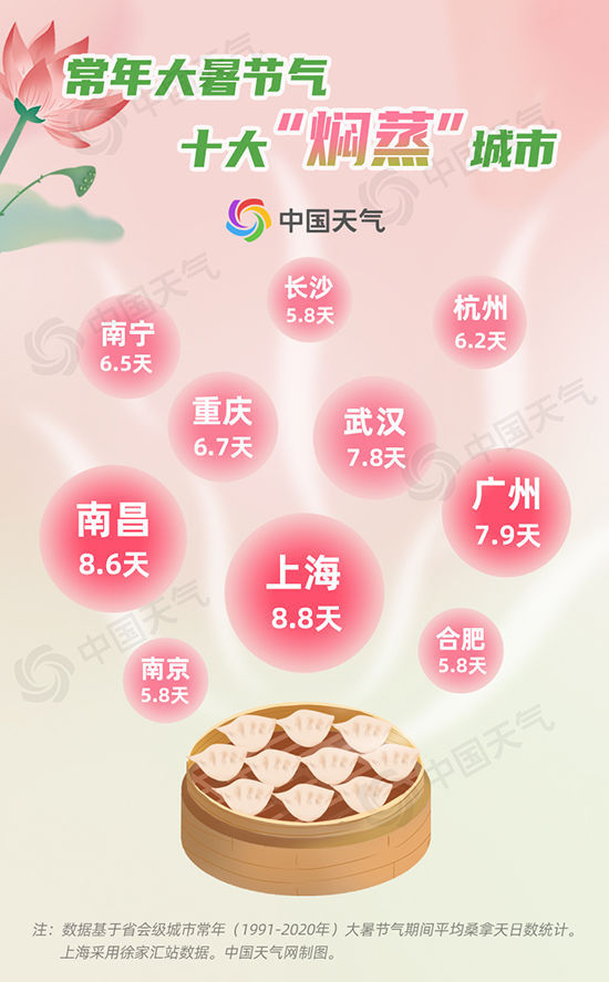 中国天气网通过盘点1991年至2020年的平均桑拿天日数发现,“焖蒸”十城全部位于南方,其中,上海(徐家汇站)大暑期间的桑拿天日数高达8.8天,为“焖蒸”之最,南昌和广州以8.6天和7.9天位列二三位。