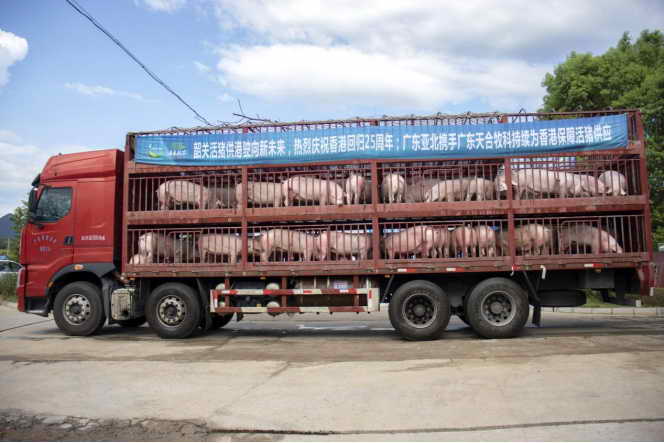 今年是广东省韶关市第二年活猪持续供港。7月20日,一辆满载生猪的运输车从位于韶关市曲江区枫湾镇的广东天合牧科活猪供港基地驶往深圳,经深圳过驳至香港。目前,韶关市有广东天合牧科等58家生产基地被认定为粤港澳大湾区“菜篮子”生产基地。2021年,销往粤港澳大湾区的农副产品主要包括瓜果蔬菜及肉禽蛋奶等,年产量达52万吨,产值24亿元以上。