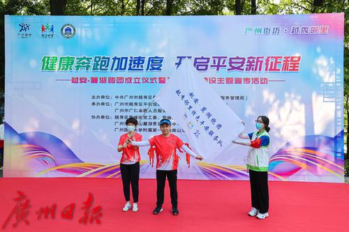 活动当天,主办方为“越安-麓湖跑团”代表进行授旗,由跑团团长进行现场宣誓,标志着越秀区“越安-麓湖跑团”正式成立。此后,跑团将通过以跑会友、寓教于跑的形式,积极参与辖内平安宣传、平安巡逻、信息报送、文明引导等平安建设工作。