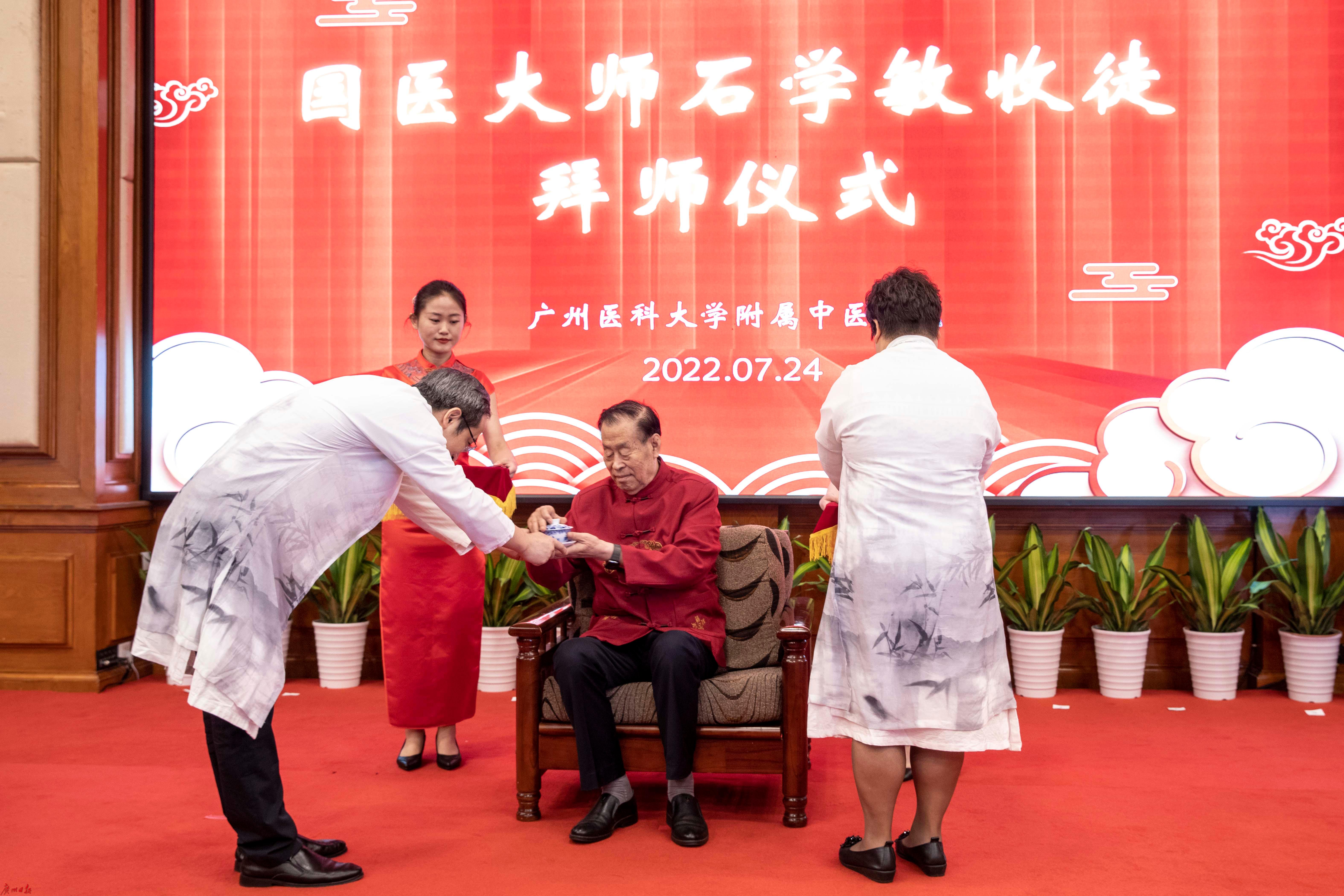 挂牌仪式上,石学敏院士接受了广州医科大学附属中医医院针灸科学术带头人李丽霞、副主任黄应杰的拜师贴及敬茶,两位弟子向老师敬赠礼物。