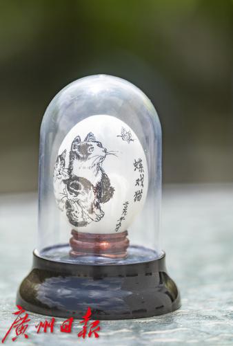 一位福利员工的的蛋壳工笔画作品《蝶戏猫》