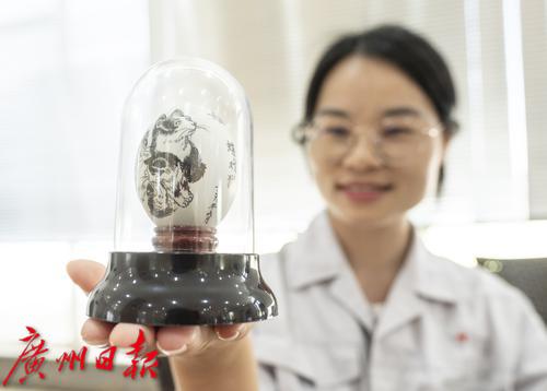工作人员展示一位福利员工的的蛋壳工笔画作品《蝶戏猫》