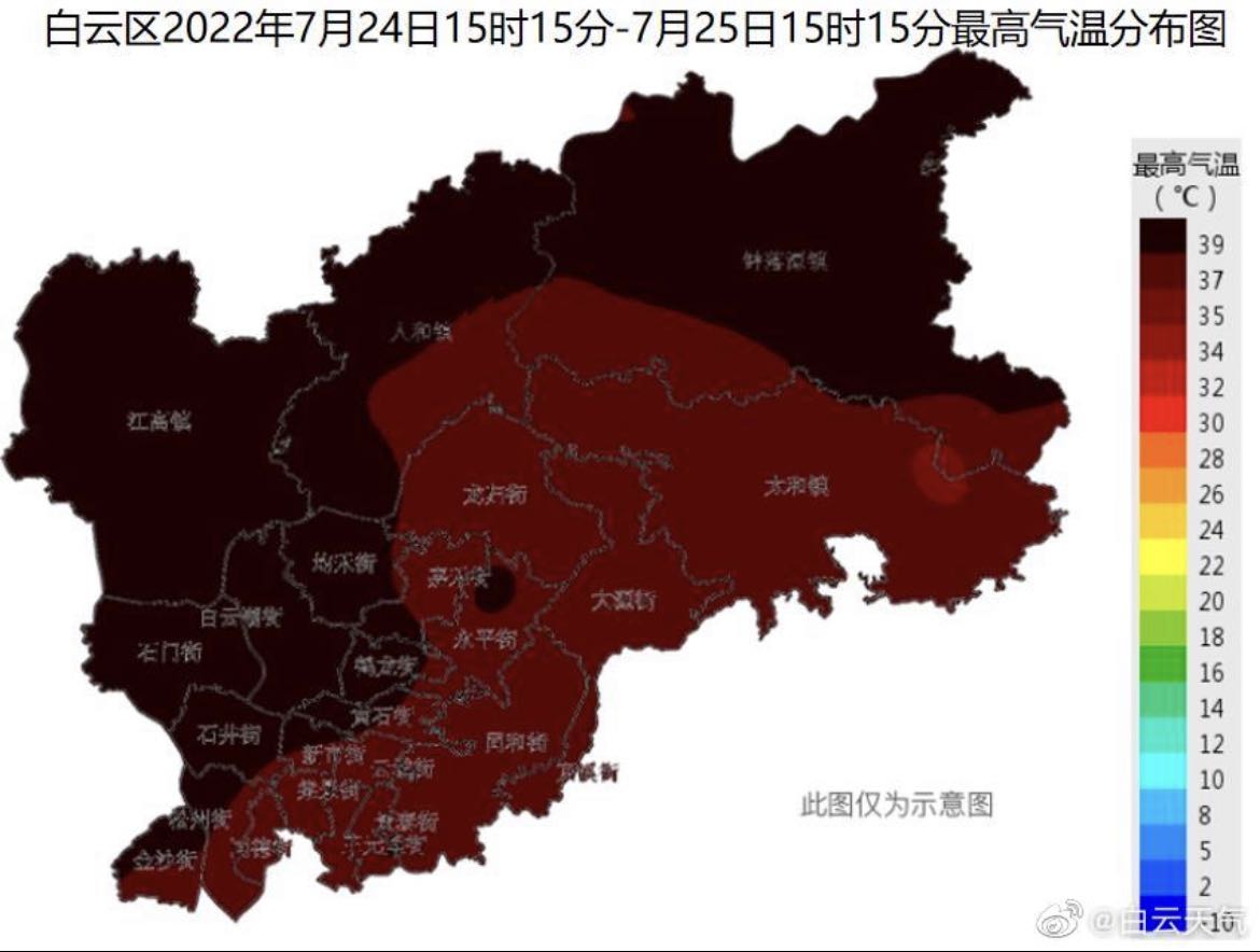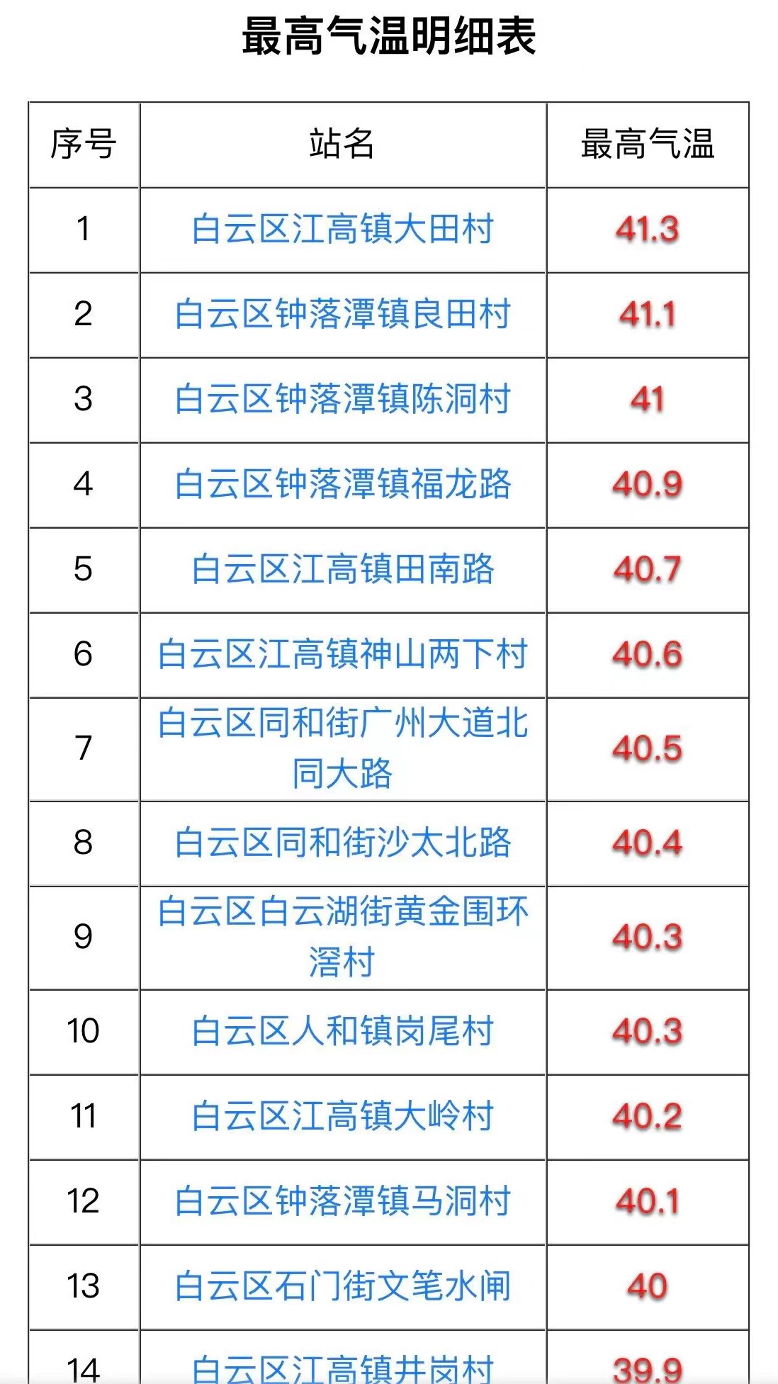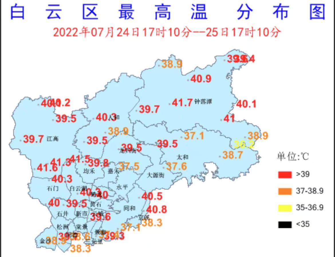 2022年07月25日14时50分一15时50分,白云区共有观测站43个,其中43个站点出现高温。全区最高气温为41.3摄氏度,出现在白云区江高镇大田村。白云区共有13个观测点的气温突破40摄氏度,分布在江高镇、钟落潭镇、人和镇、白云湖街、同和街以及石门街。