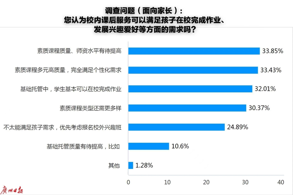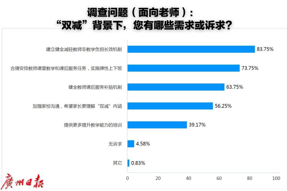 超七成受访教师认为应“合理安排教师课堂教学和课后服务任务,落实弹性上下班制度”,超六成希望健全课后服务补贴机制。据悉,目前广州大部分学校引入第三方机构,开展课后服务。学校主要负责管理课程质量与学生安全,安排学科老师在基础托管中为学生答疑解惑,支持有能力的教师开设特色课程,参与课后服务的老师可获一定补贴。但在采访过程中,部分教师指出“目前课后托管补贴发放不及时”。