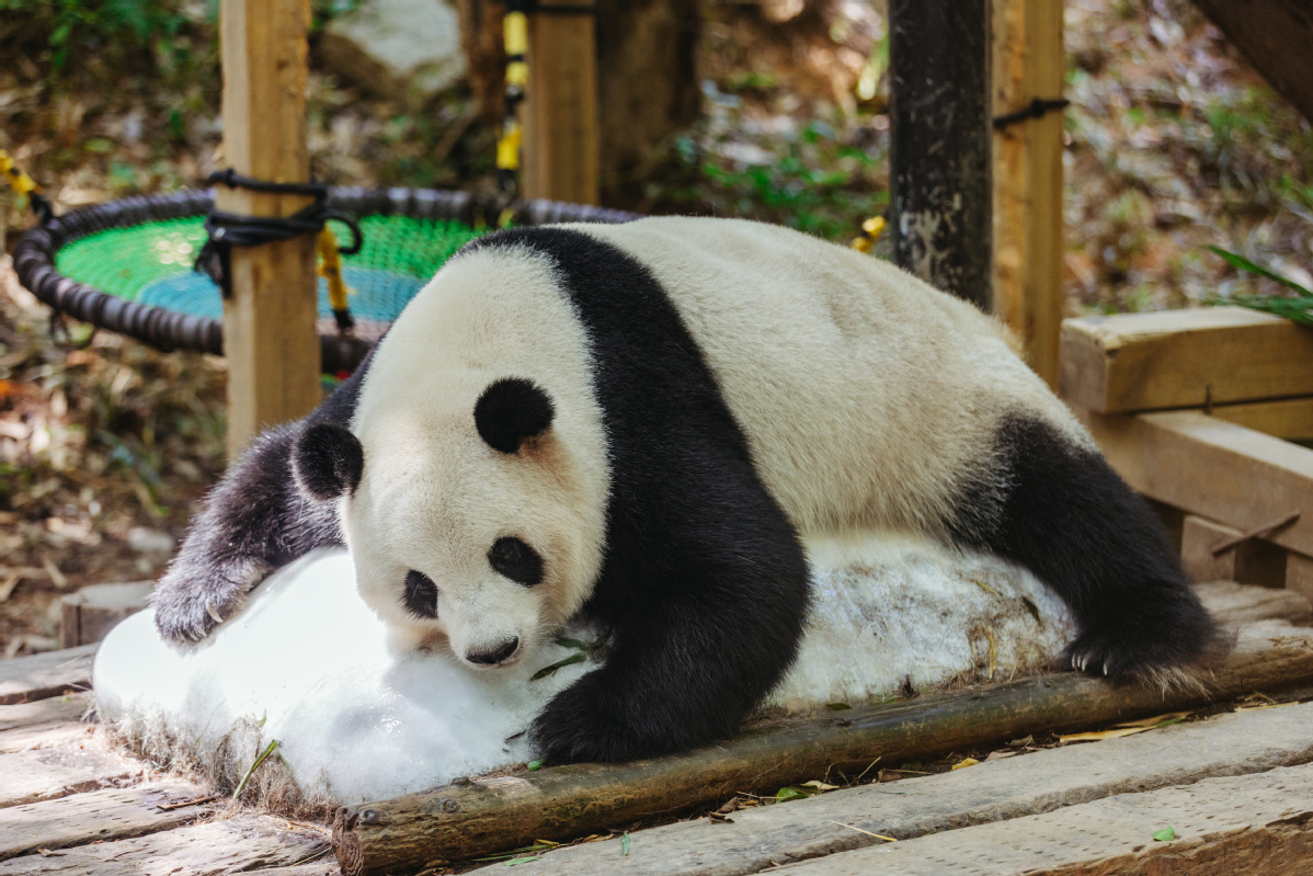 A panda lies on a block of ice to cool down in hot weather at Chimelong Safari Park in Guangzhou, Guangdong province, on July 22, 2022. [Photo by Deng Yongyi/For chinadaily.com.cn]