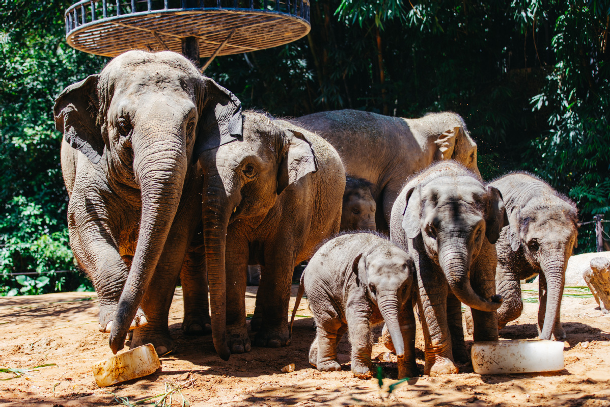 Pandas hug blocks of ice, elephants play with ice blocks, koala sits on ice, hippos eat watermelon, and Brazilian Tapirs stay in water to cool down.
