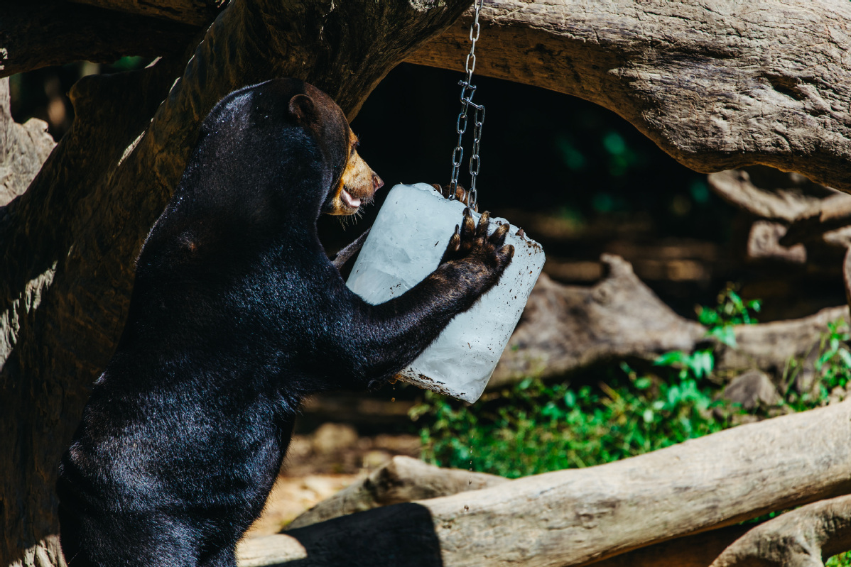 A black bear hugs a block of ice to cool down in hot weather at Chimelong Safari Park in Guangzhou, Guangdong province, on July 22, 2022. [Photo by Deng Yongyi/For chinadaily.com.cn]