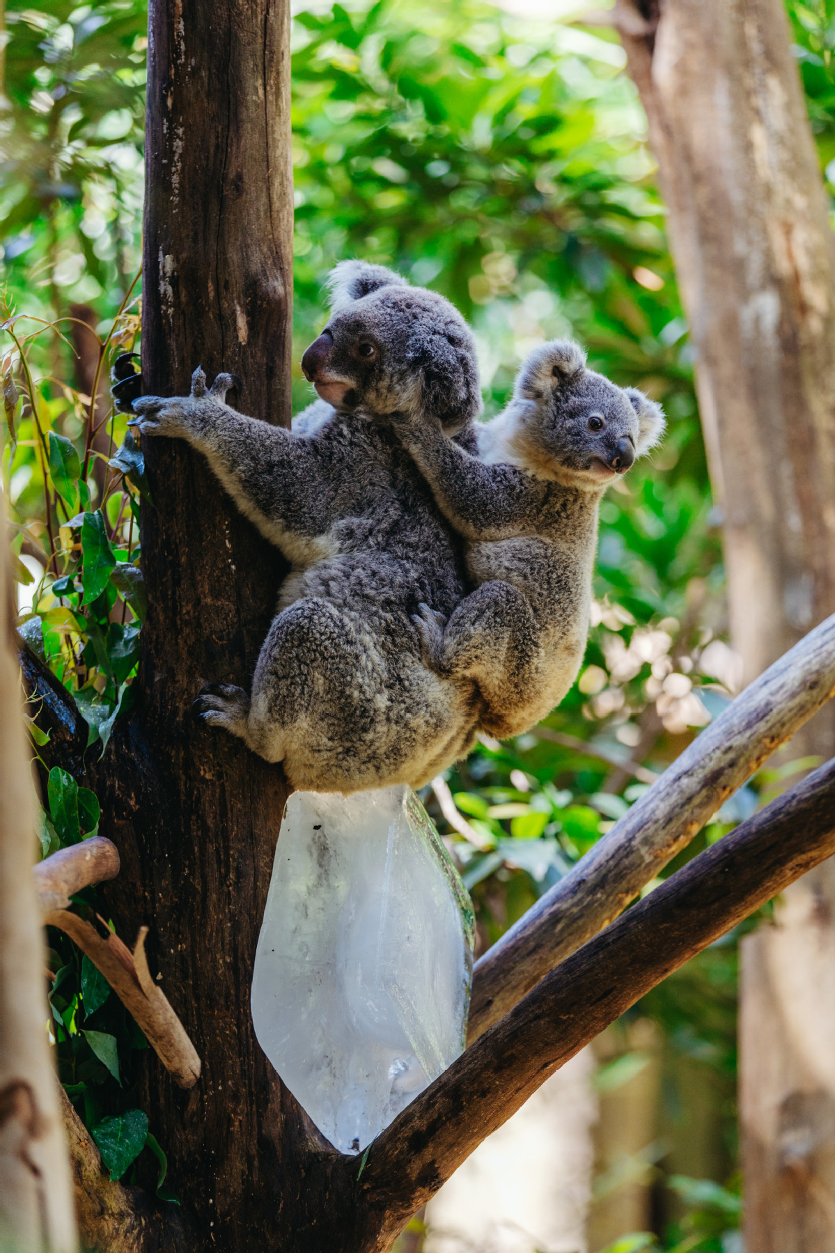 A koala with a baby on the back sits on a block of ice to cool down in hot weather at Chimelong Safari Park in Guangzhou, Guangdong province, on July 22, 2022. [Photo by Deng Yongyi/For chinadaily.com.cn]