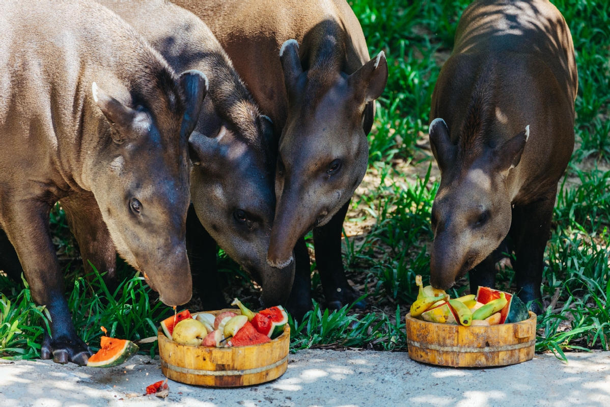 Brazilian Tapirs eat fruits to cool down in hot weather at Chimelong Safari Park in Guangzhou, Guangdong province, on July 22, 2022. [Photo by Deng Yongyi/For chinadaily.com.cn]