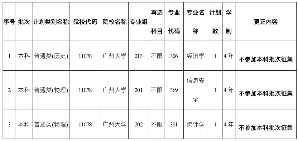 日前,广东省教育考试院公布2022广东本科批各科类补录计划,7月24日又发布了更正通知:本科补录计划有变,以下院校专业组专业将不参加补录。