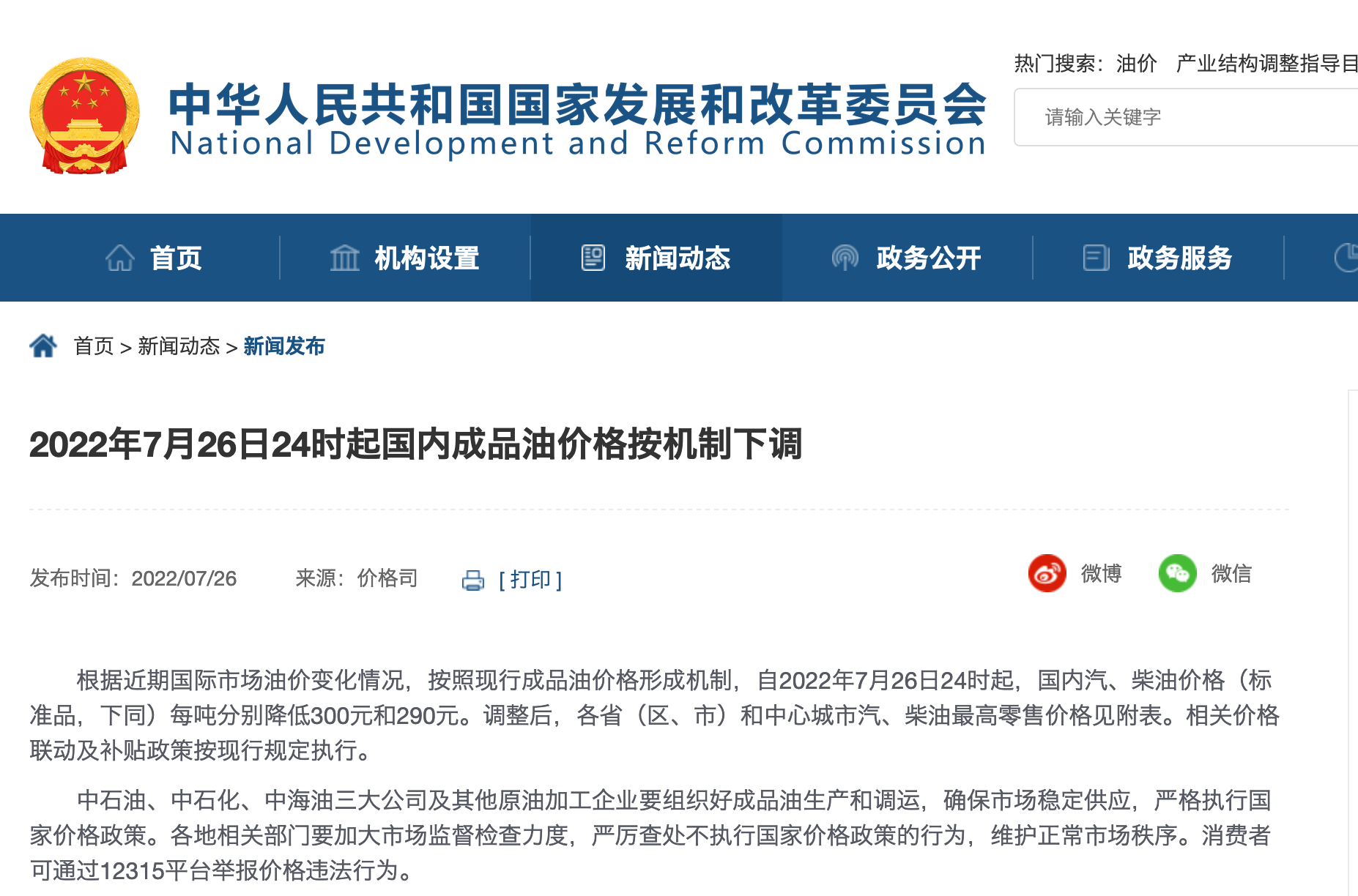 7月26日,国家发改委官网发布消息称,根据近期国际市场油价变化情况,按照现行成品油价格形成机制,自2022年7月26日24时起,国内汽、柴油价格(标准品,下同)每吨分别降低300元和290元。