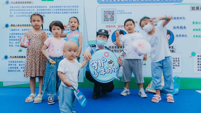 活动现场,“反诈先锋”“禁毒战警”“走私克星”“网安狙击手”“交通最前沿”“童梦护卫队”等多个功能展区林立,“保护我方未来”“人间清醒 远离毒品”等生动的用语、活泼的配色引来了许多群众的驻足围观。