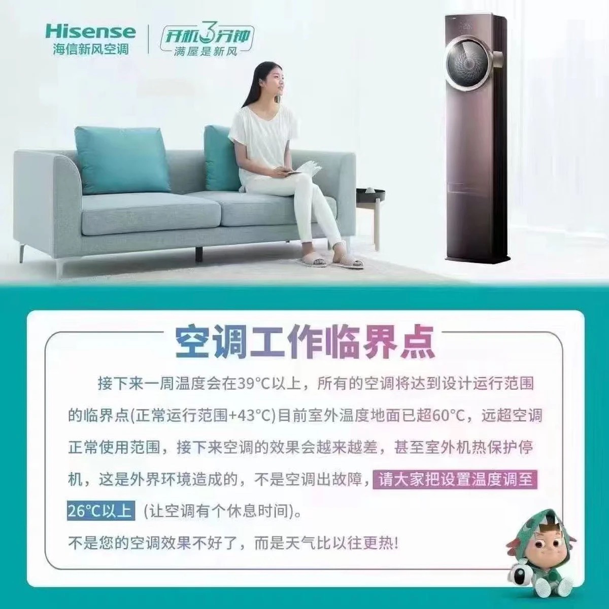 温馨提示:开空调时,建议先将温度调至26~27℃,特别是在午间室温高的情况下,保持在26℃左右即可,节能又舒适。