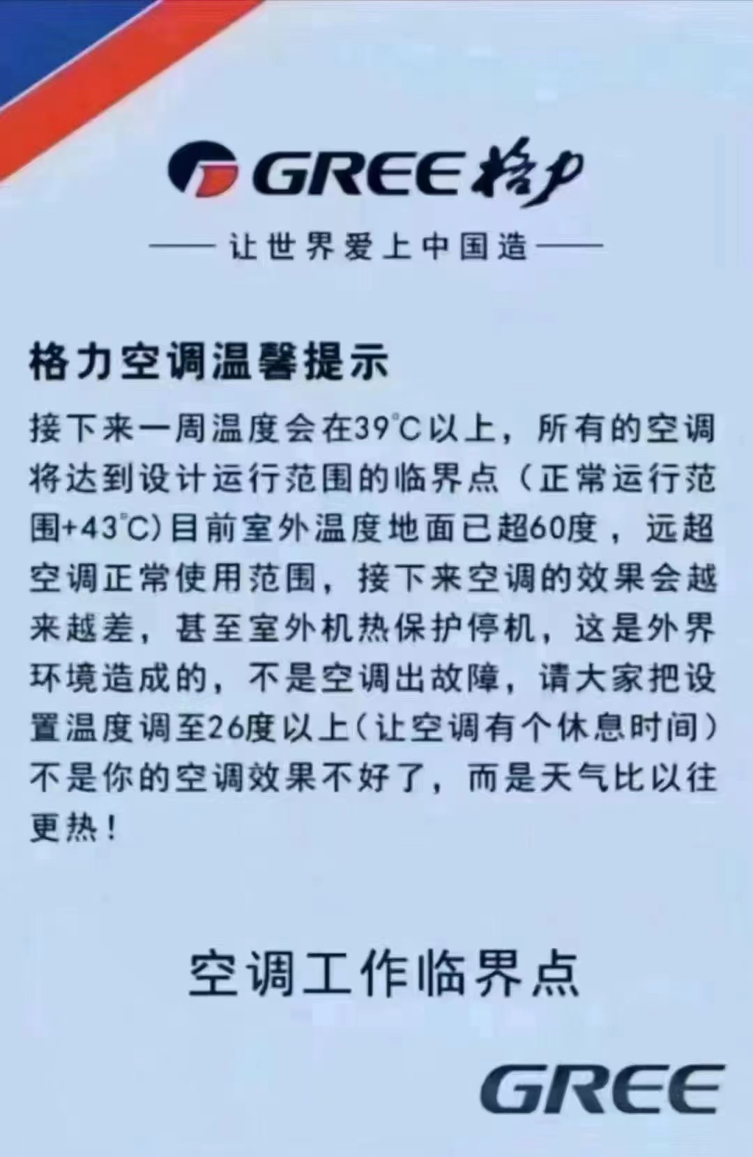 但近日一则提示内容引发了市场对于空调夏季运行使用问题的关注。网络流传一张带有格力商标的温馨提示图片显示,接下来一周温度会在39℃以上,所有的空调将达到设计运行范围的临界点(正常运行范围+43℃),并称目前室外温度地面已超60℃,远超空调正常使用范围。