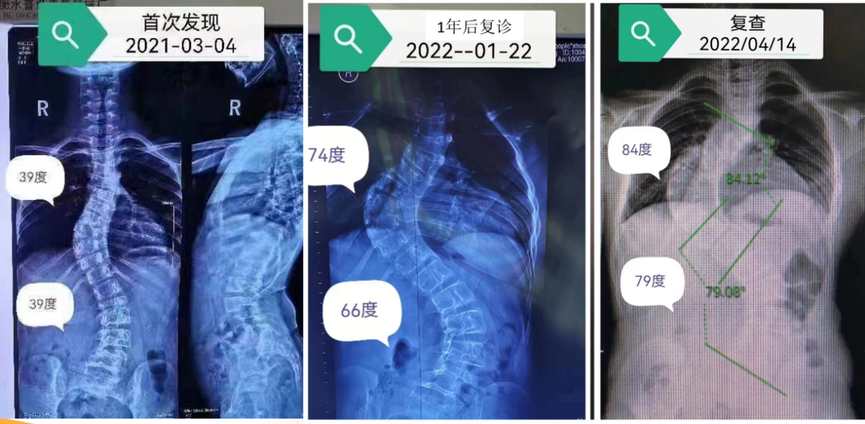 一年多前,小林因为咳嗽就诊,在拍片检查时发现了脊柱有点弯曲,当时小林的父母也留意到他的后背突起了一块,肩膀一边高一边低,但只以为是他写作业时坐姿不正造成的,并没有太在意。但随着时间推移,小林的身体倾斜越来越严重,身高也不见增长。他的父亲带小林去当地医院求医,发现小林的脊柱出现了明显的弯曲,胸椎和腰椎弯曲达到了39°,诊断为“青少年特发性脊柱侧弯”。