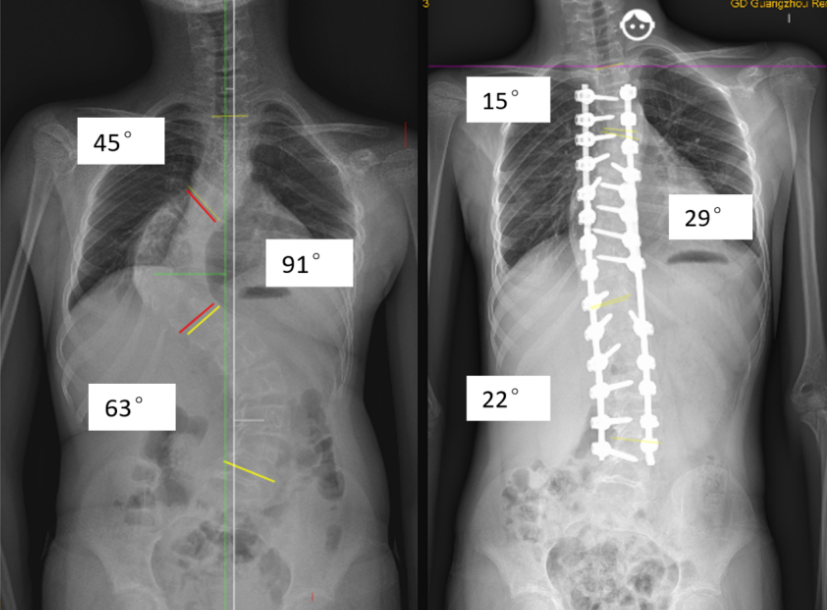 经过充分的检查以及三周的术前牵引治疗后,骨科组织了麻醉科、输血科、儿科、营养科、放射科等多学科会诊,制定拟手术方案为胸3-腰4置钉融合,胸9、腰3椎体去旋转以及顶椎区域局部椎体截骨。三周的术前牵引,令弯曲有较好的改善,其后就按原方案,运用椎体去旋转技术,置入了共27枚螺钉。这个手术用了5个小时,顺利完成,小林转入了ICU留观后,次日就转回了普通病房。