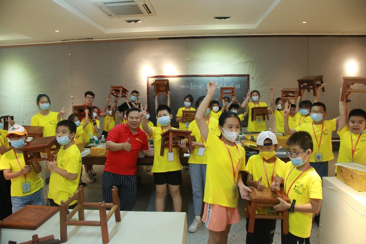 广州市松园广作家具博物馆集广作家具收藏展示、教育、文创及技艺体验和传承于一体,是广州市非物质文化遗产(广式硬木家具制作技艺)的展示保护基地。当天的课程,由广州市松园广作家具博物馆副馆长梁俊威先生主讲,他带领小朋友们参观博物馆内各年代的广作家具馆藏,近距离观察广作家具的手作过程。随后,在导师的指导下,“小候鸟”们亲自动手组装了红木小板凳,感受榫卯的精巧。