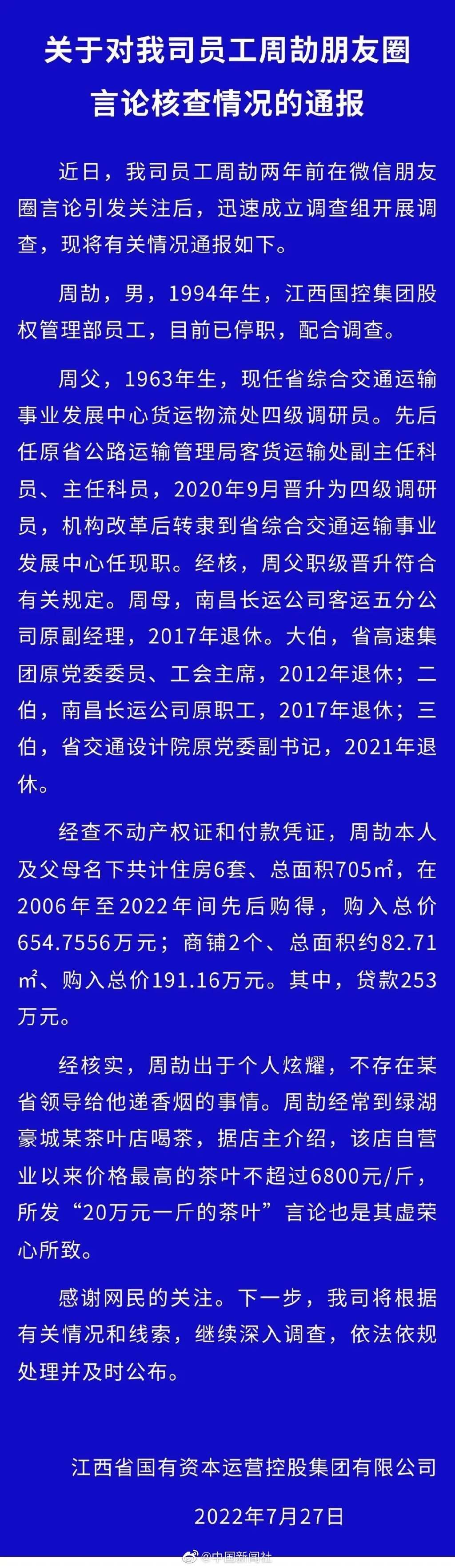 27日凌晨,江西省国有资本运营控股集团有限公司网站发布《关于对我司员工周劼朋友圈言论核查情况的通报》,其中提到:周劼,男,1994年生,江西国控集团股权管理部员工,目前已停职,配合调查。经核实,周劼出于个人炫耀,不存在某省领导给他递香烟的事情。周劼经常到绿湖豪城某茶叶店喝茶,据店主介绍,该店自营业以来价格最高的茶叶不超过6800元/斤,所发“20万元一斤的茶叶”言论也是其虚荣心所致。