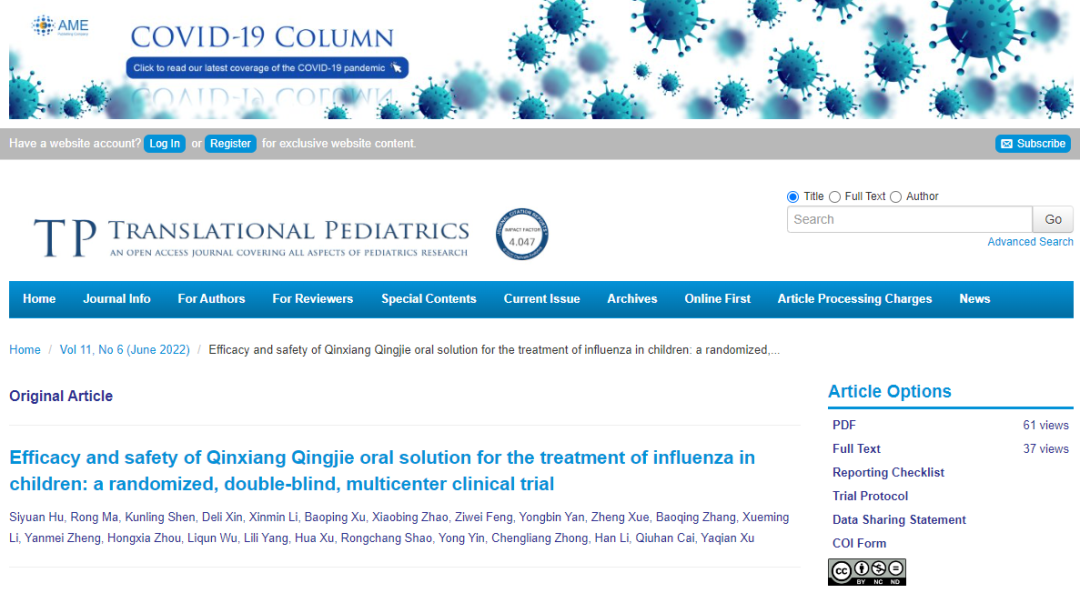 ○ 这是中国首个儿童专用药以最高循证级别验证与奥司他韦对比治疗儿童流感的临床研究,对推动中医药创新发展,用循证医学金标准验证中药独特临床价值起到示范作用。芩香清解口服液也是中国首个在国际SCI期刊发表治疗流感高质量临床研究成果的儿童专用药。
