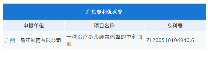 ○ 第九届广东专利奖评选结果公示,一品红儿童专用药芩香清解口服液荣获广东专利优秀奖。