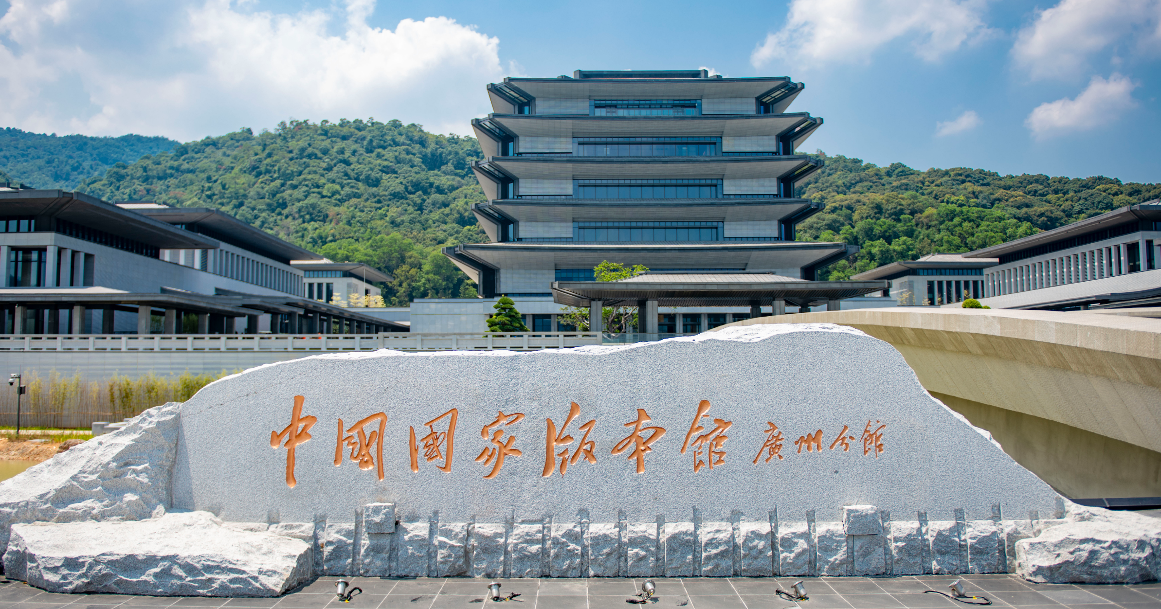 广州国家版本馆坐落于广州市从化区美丽的凤凰山麓、流溪河畔,占地面积24.69万平方米,总建筑面积9.43万平方米。入门可见流溪河水萦绕的前广场宽阔平坦,在广场前矗立的以五岭造型的馆名石上,“中国国家版本馆 广州分馆”几个字刚劲有力。文沁桥坐落在馆名石旁边,桥梁两侧使用了略微外倾的设计,由高处向下望去,整个桥体犹如在青山绿水中徐徐展开的书卷。