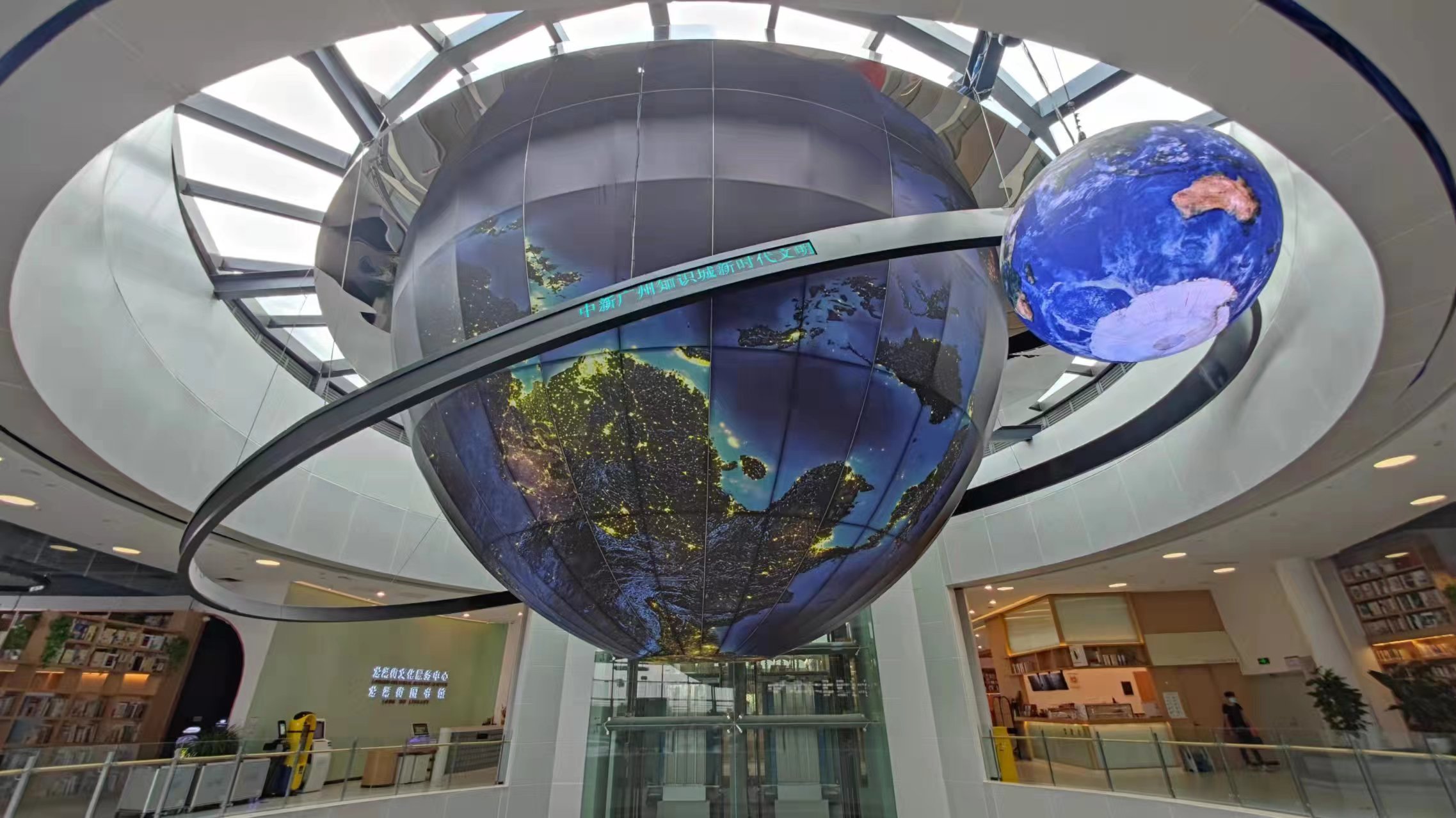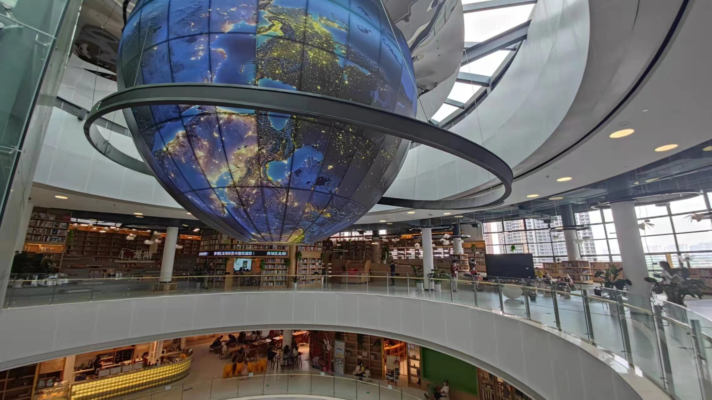 记者了解到,这座全新启用的图书馆按照“在青山绿水中展开书本”的理念打造,将生态环保的巧思融入公共文化空间的设计之中。它借用了邻里中心独特的内部建筑结构,以半开放式的设计将从一层到四层的空间连成一体。各楼层仿佛一页页从书中飞出的书页,在中空的中庭内变幻成“纸飞机”,向着浮现在图书馆顶部的巨大“蓝色星球”之上飞去;“蓝色星球”上是灯火万点的七大洲和四大洋,旁边一颗较小的“卫星”通体是一个球状电子屏,不断播放着黄埔区和中新知识城的城市景观;天花板上的液晶显示屏可以显示室内空气净化系统的数据。这一让人遐想的“探索宇宙”意象与“图书馆”的主题自然契合,引导大家进入脑力激荡的知识天地,也飞进青少年们的梦想世界。