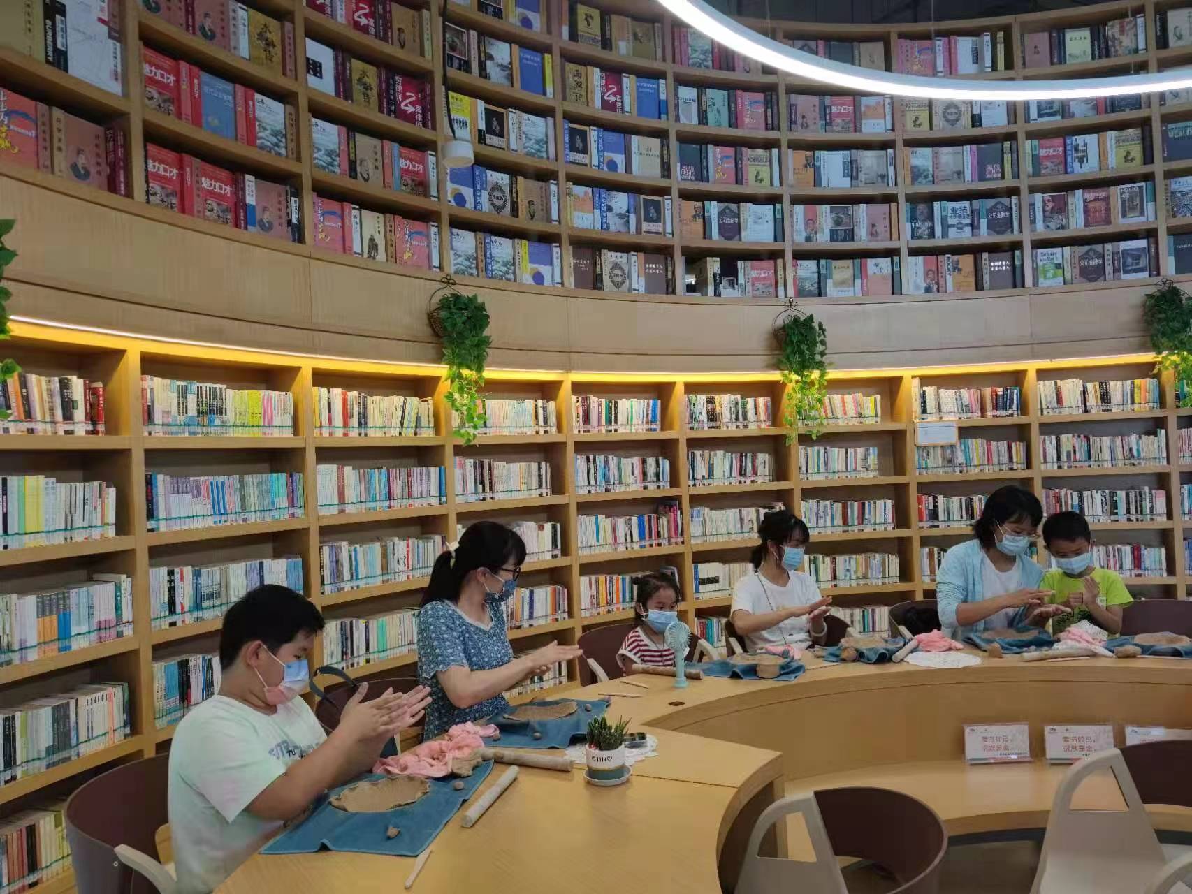 旁边,高大的圆形书架围起几张书桌。孩子和家长们正跟着白志新老师制作陶艺玉兰花盘。这位年轻的老师对记者说,现在孩子们被高楼大厦包围,少了一些在大自然中动手的机会,陶艺对协调他们的手眼协调和思维发育很有好处。