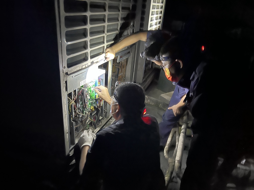 “这里是广州南站南机房,刚刚主机SK-1冷凝器冷却水进水管排水阀脱落,造成大量冷却水从阀门脱落位置流出。主机SK-1对高架候车室影响很大,我们想了很多办法,后来找了木棍,切割、打磨,制作了木堵头,将木堵头敲进排水管堵漏,重新开启主机运行。”解决了一个故障,空调班组组员施怀发举着已经变“黑”的双手,开心地笑了。