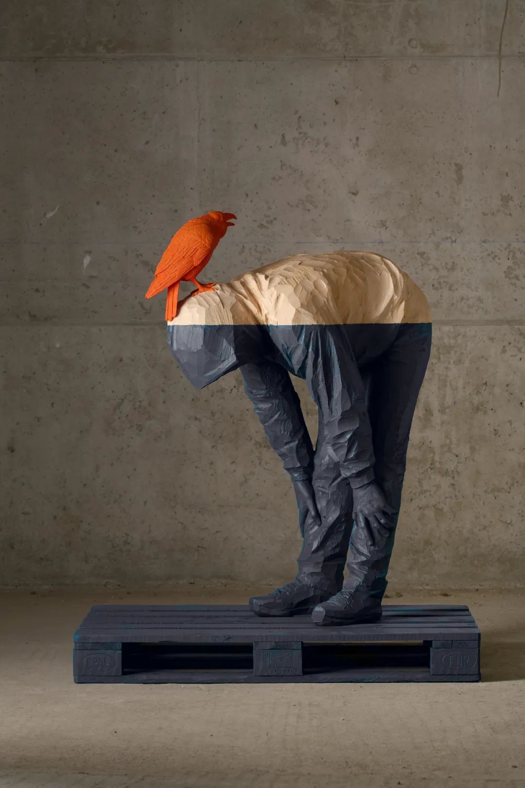 像参展艺术家布鲁诺·瓦尔波特就能够清楚地知道,木头未来会在哪里开裂,并依此进行创作。“像这次他的展品中,有一件雕像的面容完好,但我们可以看到它背后的裂痕恰到好处,就是说这个裂纹不会出现在作品最中心的部分,说明他本人对这一块木料的了解非常透彻,而且他能够预判这个木料在哪个地方可能会开裂,大概会裂一个多大的口子,来保证他的创作不受到影响。”