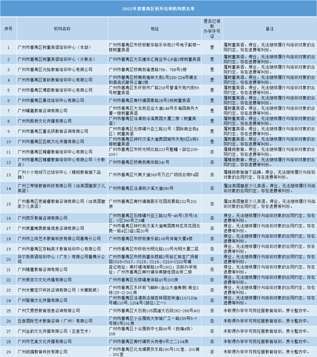 记者从广州市番禺区教育局获悉,7月27日,广州市番禺区教育局公布了2022年度番禺区校外培训机构白名单和黑名单,共29家校外培训机构被列入了黑名单,177家机构被列入了白名单。其中,洛浦街内的广州市凯特文化传播有限公司、广州三琴缘教育科技有限公司(SK英国皇家少儿英语)、广州智雅文化传播有限公司被列进黑名单。