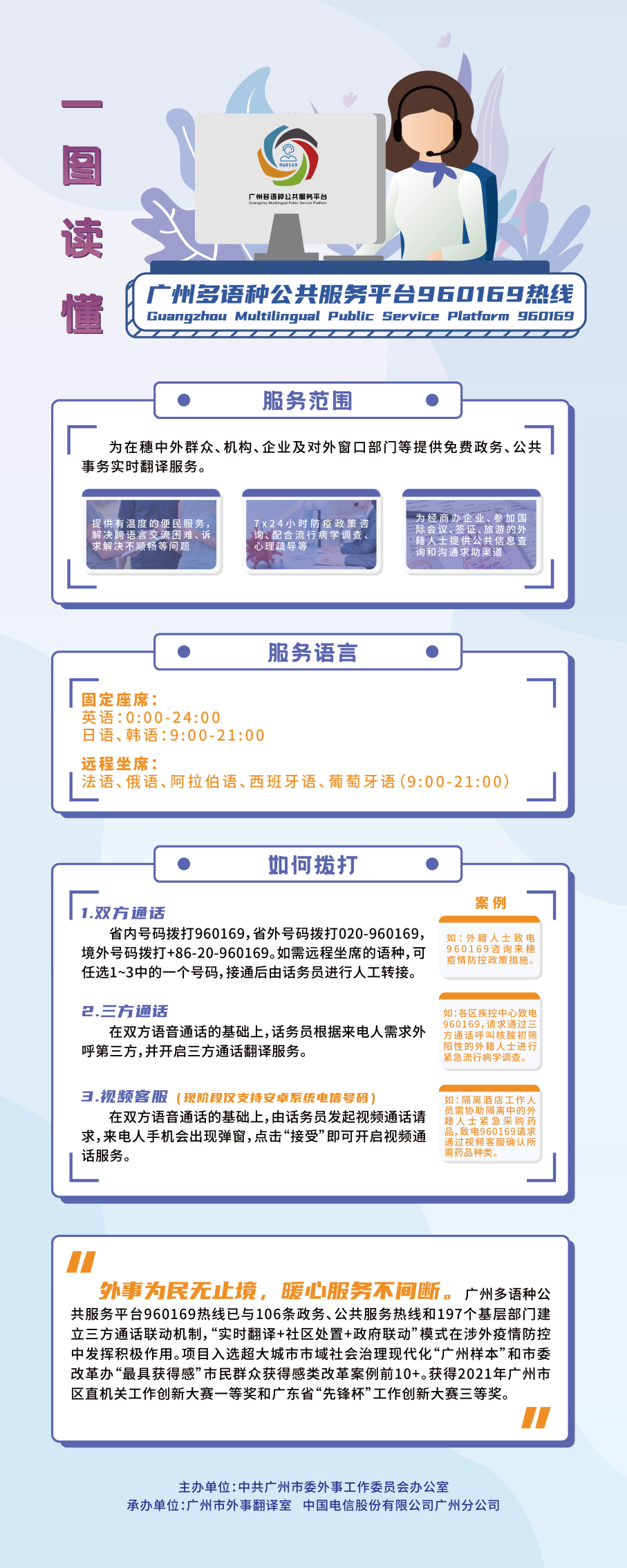 广州市委外办相关负责人介绍,三年来,960169热线坚持外事为民,全天待命、热情服务,架起中外沟通的“连心桥”,从一条单纯的翻译服务热线已逐渐成长为能有效帮助中外群众解决各种“急、难、愁、盼”的综合性、普惠性公共服务平台,让广州的涉外政务服务更有高度、解决问题更有深度、进出国门更有温度、疫情防控更有力度。为“千年商都”广州正加快建设国际交往中心、国际消费中心城市发挥了积极作用。