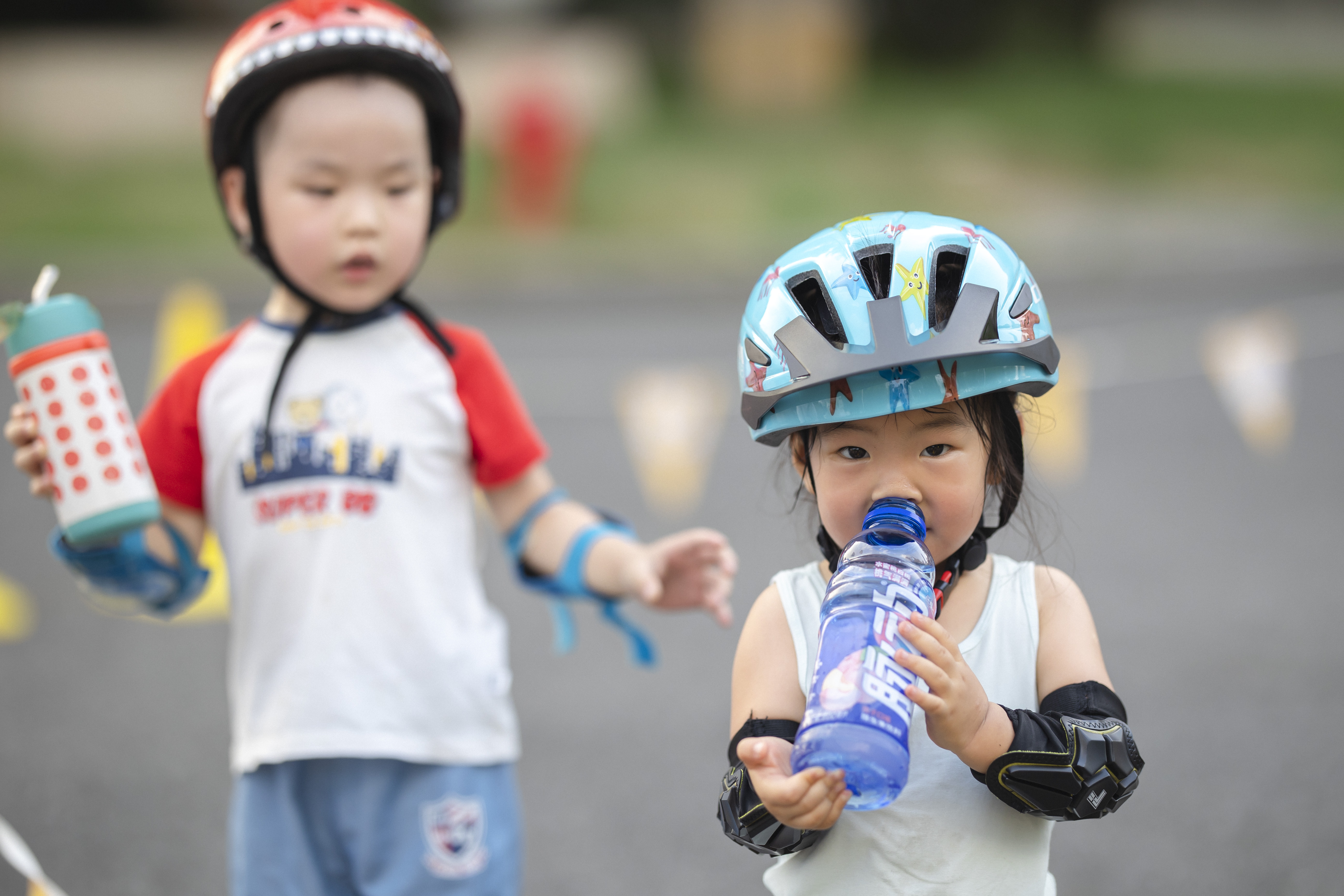7月29日,炎炎夏日气温高,体育中心,孩子们运动后及时补充水分。